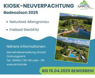 Die Gemeinde Sinntal sucht für ihre beiden Kioske im Naturbad Altengronau und im Freibad Sterbfritz einen Pächter (m/w/d). Die Badesaison beginnt je nach Wetterlage Mitte Mai und endet Mitte September. Neben der Bewirtschaftung des Kiosk übernimmt der Pächter auch den Verkauf der Eintrittskarten des Bades für die Gemeinde Sinntal. Hierfür wird eine zusätzliche Aufwandsentschädigung gezahlt. Einzelheiten über die Pachtverhältnisse können beim Ordnungsamt, Tel.: 06664 / 80-116 oder -115, erfragt werden. Eine Bewerbung ist bis zum 15. April möglich.