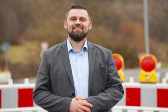 Bürgermeister Thomas Henfling berichtet vor der Absperrung der Landesstraße L 2304 in Sinntal-Mottgers