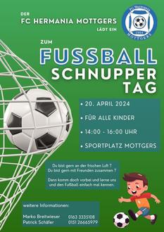 Der FC Hermania Mottgers 1954 e.V. lädt alle interessierten Kinder am Samstag, den 20.04.24 zu einem „Schnuppertag“ auf den Sportplatz nach Mottgers ein. Wie letztes Jahr ist für Speisen und Getränke für die Kinder wieder bestens gesorgt. Schnuppern Sie und Ihre Kinder doch einfach mal vorbei