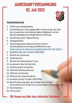 Der TSV Altengronau lädt alle Mitglieder sowie Vereinsinteressierte herzlich zur diesjährigen Jahreshauptversammlung ein. Diese findet am Mittwoch, den 2. Juli 2025, ab 19:00 Uhr im TSV Vereinsheim am Aspenweg 52 in Sinntal-Altengronau statt. Stimmberechtigt sind ausschließlich die Vereinsmitglieder.