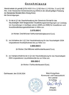 Der Haushaltsplan liegt zur Einsichtnahme vom 01.07.2024 bis 09.07.2024 im Rathaus der Gemeinde Sinntal, Am Rathaus 11, 36391 Sinntal, Zimmer 3 (Gemeindekasse), zu folgenden Uhrzeiten öffentlich aus: