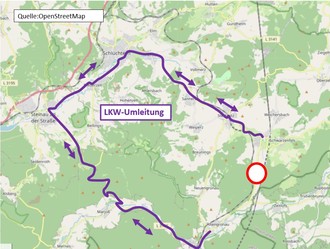 Da die L3371 von Sinntal-Sterbfritz nach Sinntal-Altengronau eine Höhenbegrenzung von 3,3 m und eine Tonnagebegrenzung von 16 t aufweist, erfolgt die Umleitung für den LKW-Verkehr wie bisher großräumig über Schlüchtern und Steinau an der Straße in beiden Fahrtrichtungen.