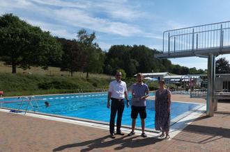 Nadine Jäger vom Personalrat und Bürgermeister Carsten Ullrich nutzten das aktuelle Schwimmbadwetter und gratulierten dem frisch gebackenen Meister am Beckenrand im Waldschwimmbad Sterbfritz zu seinen bestandenen Prüfungen.