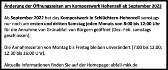 Ab September 2022 hat das Kompostwerk in Schlüchtern-Hohenzell samstags nur noch am ersten und dritten Samstag jeden Monats von 8:00 bis 12:00 Uhr für die Annahme von Grünabfall von Bürgern geöffnet (Dez.-Feb. samstags geschlossen).