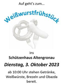 Der Schützenverein lädt am Dienstag, 03.10.20232 zu seinem traditionellen Weißwurstfrühstück ein. Ab 10:00 gibt es Brez´n, Weißwürste, Obazda und bayerisches Bier. Jedermann ist herzlich eingeladen, ein paar gemütliche Stunden im Schützenhaus am Grauberg zu verbringen.