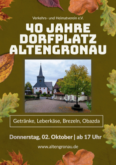 Der Verkehrs- und Heimatverein Altengronau lädt am 2. Oktober ab 17 Uhr zur Feier des 40-jährigen Bestehens des Dorfplatzes ein. Die Besucher erwartet ein herbstlich gestaltetes Fest mit Getränken sowie kulinarischen Spezialitäten wie Leberkäse, Obazda und Brezeln. Zudem werden historische Fotos des Dorfplatzes aus vergangenen Tagen präsentiert. Alle Bürgerinnen und Bürger sind herzlich eingeladen.