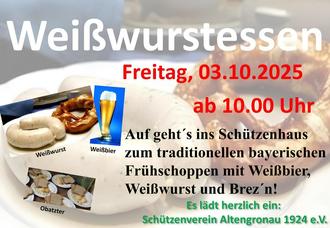 Der Schützenverein Altengronau lädt am Freitag, 03.10.2025 zu seinem traditionellen Weißwurstfrühstück ein. Von 10:00 bis 14:00 Uhr gibt es Weißwürste, Brezeln, Obazda und bayerisches Bier. Jedermann ist herzlich eingeladen, ein paar gemütliche Stunden im Schützenhaus am Grauberg zu verbringen.