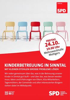 Der SPD-Ortsverein Sinntal lädt herzlich zur Veranstaltung „Kinderbetreuung in Sinntal - Mit kleinen Stühlen große Probleme lösen“ am Freitag, 24. Oktober 2025, um 19:00 Uhr in der Mehrzweckhalle Mottgers ein.