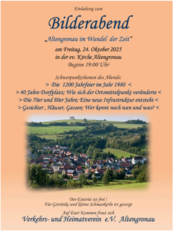 Der Verkehrs- und Heimatverein Altengronau lädt am Freitag, 24. Oktober 2025, um 19:00 Uhr in die ev. Kirche Altengronau ein. Gezeigt werden historische Aufnahmen zur 1200-Jahrfeier, zum Dorfplatz, zur Entwicklung der 70er/80er Jahre und zu bekannten Gesichtern und Orten.