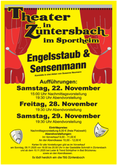 Das Theaterspielen hat in Züntersbach eine lange Tradition, die bis in die Anfänge des letzten Jahrhunderts zurückreicht. Während früher in der Gaststätte Schmidt gespielt wurde, finden die Theateraufführungen seit mehr als 30 Jahren auf der Bühne des Sportheims der Turn- und Sportgemeinschaft Züntersbach statt. In diesem Jahr präsentiert die Theatergruppe Züntersbach das Stück "Engelsstaub & Sensenmann". Die Komödie in drei Akten wurde von Susanne Neumann, die Mitglied der Laienspielgruppe ist, selbst geschrieben und handelt von einem Maler und Lackierer, der davon träumt, ein berühmter Portraitmaler zu werden. Für diesen Traum ist der junge Mann bereit so einiges zu unternehmen, doch es ist wie im wirklichen Leben: Auf dem Weg zum großen Künstler passiert Unvorhergesehenes. Es wird geliebt, gehasst, gekämpft, und dann tauchen da auch noch ein Engel und der Sensenmann auf. Wie das Ganze ausgeht, erfahren die Zuschauer in der etwa zweistündigen Aufführung und erleben dabei garantiert die eine oder andere Überraschung. Die Theatergruppe freut sich auf jeden Fall schon sehr darauf, das Publikum zum Lachen und Staunen zu bringen.