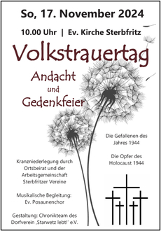 Es wird im Besonderen an die Sterbfritzer Gefallenen und die, ermordeten jüdischen Bürger des Jahres 1944 erinnert und das Projekt „DENK mal „ vorgestellt werden.