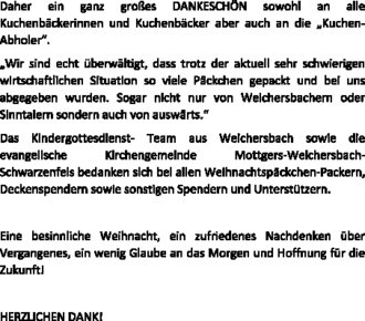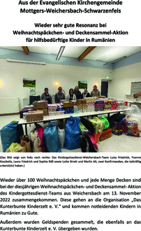 Das Kindergottesdienst- Team aus Weichersbach sowie die evangelische Kirchengemeinde Mottgers-Weichersbach-Schwarzenfels bedanken sich bei allen Weihnachtspäckchen-Packern, Deckenspendern sowie sonstigen Spendern und Unterstützern.