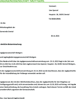 Die Niederschrift über die Jagdgenossenschaftsversammlung vom 25.11.2022 liegt in der Zeit vom 05.12.2022 bis 11.01.2023 bei dem Jagdvorstand Uwe Sperzel, Hauptstr. 36, 36391 Sinntal Mottgers, zur Einsichtnahme aus.