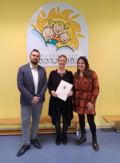 Unser Bild zeigt v.l.n.r.: Bürgermeister Thomas Henfling (parteilos), Jubilarin Diana Hornung und Kindergartenleiterin Lena Röll