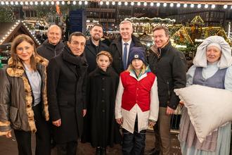 Die drei Bergwinkel-Bürgermeister Thomas Henfling (Vierter von links), Christian Zimmermann (Vierter von rechts) und Matthias Möller (Zweiter von rechts) haben gemeinsam mit dem Frankfurter Oberbürgermeister Mike Josef (Dritter von links), Vertretern der Tourismus + Congress GmbH und den Steinauer Märchenfiguren den Weihnachtsmarkt eröffnet.