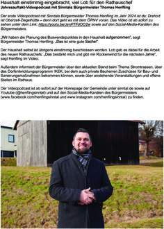 Außerdem informiert der Bürgermeister über den aktuellen Stand beim Thema Stromtrassen, über das Dorfentwicklungsprogramm IKEK, bei dem auch private Bauherren Zuschüsse für Bau- und Sanierungsmaßnahmen bekommen können, sowie über anstehende Veranstaltungen und offene Stellen im Rathaus.