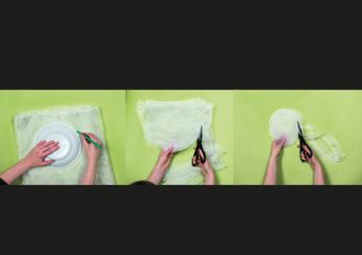 Wellige Tentakel stellt ihr aus dünnem Stoff oder Transparentpapier her. Legt beides dazu jeweils in mehreren Lagen aufeinander, sodass der Teller noch darauf passt. Er dient euch als Schablone: Zeichnet um den Teller herum einen Kreis auf (wie im Bild ganz links) und schneidet ihn aus (wie im Bild in der Mitte). Den Kreis schneidet ihr spiralförmig von außen nach innen zu (wie im Bild ganz rechts). Die Streifen, die dabei entstehen, sollten 1 bis 2 cm breit sein.