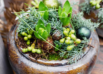 - Alternativ: Kiefern- und Buchsbaumzweige mit Moos zu kleinen Gruppen bündeln