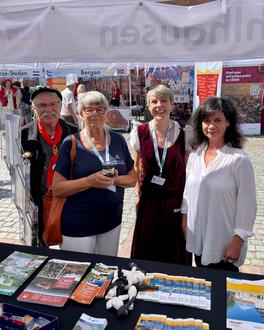 v.l.: Hanseradler Hans aus Lübeck, Inger Harlevi, Vizepräsidentin des Internationalen Hansebundes, Mandy Wagner (Tourist Information Mühlhausen) und Andrea Unrein (Stadtmarketing Mühlhausen)