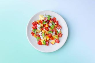 Im Sommer wäre es natürlich verlockend, Obst und Gemüse gekühlt zu verzehren. Leider ist es aber weder dem Aroma von Tomaten noch dem von Pfirsichen besonders zuträglich, wenn man sie tagelang im Kühlschrank aufbewahrt. Deshalb Tomate und Pfirsich nach dem Einkauf unbedingt bei Zimmertemperatur aufzubewahren und den Salat dann ebenfalls ungekühlt zubereiten. Wer das Ganze trotzdem leicht gekühlt genießen möchte, stelle den Salat lieber nach der Zubereitung einmal für eine gute Stunde in den Kühlschrank. Dabei das garantiert luftdichte Abdecken nicht vergessen, sonst schmeckt der Salat später - wie leider alles, was man ohne Abdeckung in den Kühlschrank stellt - nach einer wenig delikaten, aber sehr ausgewogenen Mischnote des Kühlschrankinhalts.