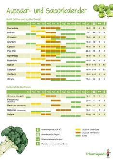 Im nach Gemüsearten sortierten Pflanzkalender lässt sich zudem nach der Keimtemperatur (KT), Keimdauer (KD), Pflanzenabstand (PA) und der Dauer in Monaten von der Aussaat bis zur Ernte (AE) recherchieren.