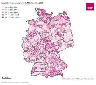 Die Deutschlandkarte zeigt, wie gut oder schlecht die Regionen mit Hausärzten versorgt sind. BPL-Umfrage der Krankenversicherungen