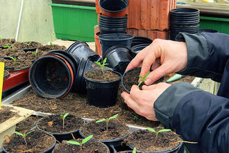 - Umtopfen: Sobald sich die ersten "normalen" Blätter zeigen, ist es Zeit für die Jungpflanzen, in grössere Töpfe umzuziehen. Denn nun brauchen die Pfanzen mehr Platz, um sich optimal entwickeln zu können. Verwenden Sie dafür einen Pikierstab und heben Sie die Sämlinge vorsichtig heraus. Verwenden Sie ab jetzt normale Blumenerde, denn nun braucht die Jungpflanze mehr Nährstoffe.