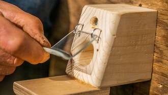 Zunächst ein Loch mit einem Forstner-Bohrer (ideal ist ein Durchmesser von 40 Millimetern) mittig in die Front der Holzkiste bohren. Dieses dient den Hummeln später als Eingang. Ein ebenso großes Loch vorne in die Pappkiste schneiden. Zwei Holzleisten oder Steine als Abstandhalter auf den Boden der Holzkiste setzen und den Karton darauf platzieren. Die Pappröhre gegebenenfalls etwas einkürzen, durch die Löcher beider Kisten schieben und sie so miteinander verbinden.