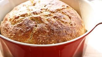 Während des Gehens den Ofen auf 230°C vorheizen und einen Bräter aus Keramik oder Glas mit Deckel für 30 Minuten im unteren Drittel vorheizen. Backfertigen Teig in die Auflaufform stürzen und den Deckel darauflegen. 30 Minuten backen, danach den Deckel entfernen und das Brot je nach gewünschter Bräunung etwa 20 Minuten weiterbacken. Das fertige Brot aus der Bratreine herausholen und auf einem Gitter einige Minuten abkühlen lassen.