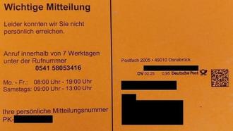 Die Verbraucherzentrale Mecklenburg-Vorpommern schlägt wegen der angeblichen Mitteilungen Alarm: In vielen Regionen Deutschlands tauchen demnach derzeit die falschen Benachrichtigungskarten in Briefkästen auf. Auf den Karten prangt in großen Buchstaben: "Wichtige Mitteilung. Leider konnten wir Sie nicht persönlich erreichen." Dazu wird eine Telefonnummer angegeben, die innerhalb von sieben Werktagen kontaktiert werden soll.