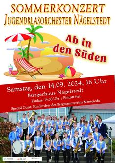 Das Jugendblasorchester Nägelstedt freut sich darauf am Samstag, den 14.09.2024 um 16 Uhr im Bürgerhaus in Nägelstedt wieder ein Konzert mit dem Motto „Ab in den Süden - Chor trifft Orchester“ präsentieren zu können. Die Besonderheit dabei ist, dass dieses Konzert gemeinsam mit dem Kinderchor des Bergmannvereins Menteroda stattfindet. Dafür üben beide Ensembles schon seit Beginn des Jahres.