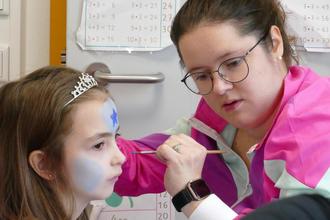 Auch ein Kinderschminken wurde angeboten. Aus Büchern konnten sich die Kinder Motive aussuchen und sich auf das Gesicht zaubern lassen. Bei den Kindern war die Aktion so beliebt, dass sich manche das frische Make-Up wieder abwuschen, um sich erneut schminken zu lassen.
