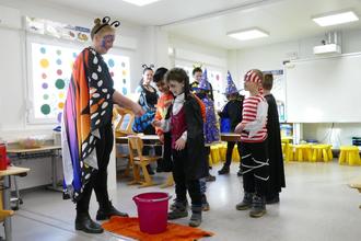 Besonders aufgeregt waren die Kinder wegen der Kostümprämierung am Ende des Schultags. Auf einem Laufsteg konnten sie ihre Kostüme präsentieren. Wer sich nicht alleine traute, durfte auch gemeinsam mit einem Freund laufen. Donnernden Applaus und viel Jubel ernteten alle, die sich über den Laufsteg wagten. Nachdem sich ein Komitee von Lehrerinnen zur Beratung zurückgezogen und entschieden hatte, wurden die Kostüme von jeweils einem Jungen und einem Mädchen aus jeder Klasse prämiert.