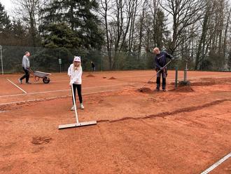 Beim TC Oberbiel kann man es kaum noch erwarten, bis endlich wieder auf den Plätzen gespielt werden kann. Deshalb trafen sich am Samstag, den 30. März ein paar freiwillige Helfer, um die Plätze wieder aufzubauen. Den alten Sand und das Moss abkratzen und anschließend die Plätze glatt walzen. Drei Stunden waren 10 Freiwillige mit den drei oberen Plätzen beschäftigt.