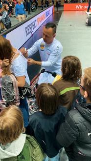 Treffpunkt war am Eingang der heimischen Spielstätte des Erstligisten. Gemeinsam wurde die große Buderus Arena in Wetzlar betreten, wo die Teilnehmenden gar nicht mehr aus dem Staunen heraus kamen. Eine Halle mit einer großen Spielfläche, einer Menge Tribünen und lauter Musik. Als die Kinder die Halle betraten und nach ihren Plätzen Ausschau hielten, machten sich die beiden Teams schon auf dem Spielfeld warm. Das letzte Saisonspiel stand gegen die Rhine River Rhinos Wiesbaden an. Die deutsche Meisterschaft war zu diesem Zeitpunkt schon entschieden, doch trotzdem war es ein sehr spannendes Spiel und beide Mannschaften übernahmen immer wieder die Führung. Am Ende konnte der RSV Lahn-Dill mit einem 73:63 gewinnen und die Saison ungeschlagen beenden. Mit dem Meisterschaftspokal im Foyer konnten viele Fotos gemacht werden, doch das größte Highlight wartete noch nach Abpfiff auf die Teilnehmenden. Sie konnten mit allen Spielenden sprechen und sich Unterschriften auf ihren T-Shirts und Basketbällen abholen. Am Ende haben sich alle mit neuen Erinnerungen nach Hause verabschiedet.