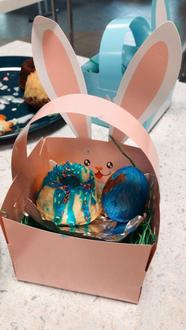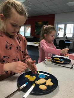 Und dann ging es auch schon los. In zwei Gruppen konnten jeweils zwei Mini-Küchlein und ganz viele Butterplätzchen gebacken werden. Damit die Plätzchen auch richtig österlich aussehen, gab es Ausstechförmchen in frühlingshaften Formen. Während also die eine Hälfte der Kinder den Teig ausrollt, mixt die andere Gruppe bereits den Kuchenteig und lässt diese in Mini-Gugelhupf Formen ein. Ob heller oder dunkler Teig, ob marmoriert oder einfarbig, hier konnten die Kinder ihrer Kreativität freien Lauf lassen. Nach einer kurzen Verschnaufpause, tauschten die Kinder ihre Gruppen. Während schließlich alles im Ofen ist, bemalen die Teilnehmenden noch ihre ganz persönlichen Ostereier. Zum Ende der Veranstaltung gestalten alle noch die frisch gebackenen Leckereien mit buntem Zuckerguss und vielen Zuckerperlen. Eingepackt wird am Ende alles in ein persönliches Osternest. „In eurer Osterbäckerei riecht es aber köstlich“, sagt ein Papa als er sein Kind abholen möchte. „Das riecht nicht nur gut, sondern schmeckt auch noch“, lacht eine Teilnehmerin.