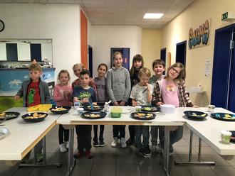 11 Solmser Ferienkinder trafen sich am Gründonnerstag um in der Osterbäckerei im Jugendzentrum österliche Leckereien herzustellen.