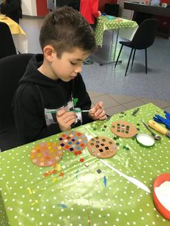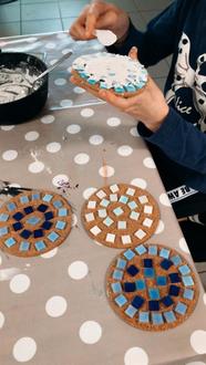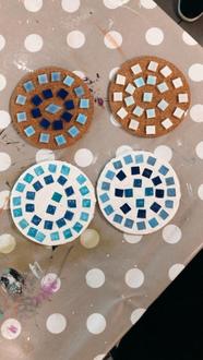Alle Teilnehmenden bekamen vier Korkuntersetzer, die sie mit Mosaiksteinen bekleben konnten. Die bunten Glasteilchen wurden mit Hilfe von Fugenmasse an die Untersetzer befestigt. Dafür musste zuerst eine dünne Schicht der Fugenmasse auf den Untersetzern verteilt werden, die anschließend mit den verschiedengeformten Teilchen individuell gestaltet wurden. Hier waren der Kreativität keine Grenzen gesetzt. Ist das Konstrukt angetrocknet, wird darüber noch eine weitere dünne Schicht der Fugenmasse verteilt. Hier benötigten die Solmser Ferienkinder besonders viel Geduld. Zum Schluss werden die Steine vorsichtig mit einem Schwamm von der überschüssigen Fugenmasse befreit. Nach einem weiteren Trocknungsprozess, halten die Kinder ihre fertigen Mosaik-Untersetzer in der Hand und können sie nun Zuhause als Glas- oder Teeuntersetzer verwenden.