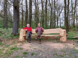 XXL-BANK: Erbauer Hans-Jürgen Lindenthal (links) mit dem HuK-Vorsitzenden Hans-Helmut Hofmann beim Probesitzen mit "Weitblick".