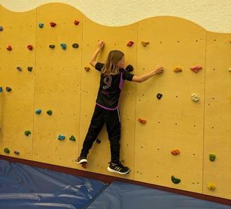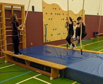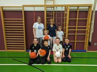 Die beiden Übungsleiter motivierten die Kids durch Aufbauten, sich beim Bouldern, Balancieren an schrägen und wackelnden Bänken, beim Schwingen und Hangeln an Tauen oder beim abschließenden Spiel mit den Basketbällen an den hohen Körben sich auszuprobieren und zu beweisen.