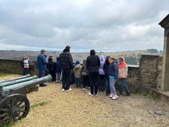 Die Führung begann im Schlosshof, wo sie erfuhren, dass der Graf von Solms noch in dem Schloss wohnt. Auf dem Boden konnten die Kinder das Braunfelser Wappen deutlich erkennen. Anschließend ging es in den Rittersaal. Hier wartete eine Aufgabe auf die Kinder. Sie bekamem Ausschnitte von Fotos in die Hand. Die Gegenstände, die darauf zu erahnen waren, sollten sie in dem Rittersaal finden. Die Kinder konnten aber nicht nur das Schloss bestaunen, sondern auch die Kanonen. „Wie denkt ihr denn eigentlich, wie die Kanonen damals funktioniert haben?“, fragte der Schlossführer.
