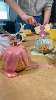 Die Woche startete mit österlichen Leckereien. Die Kinder und Jugendlichen verwandelten dabei das JUZ in eine echte Bäckerei. Neben Mini-Gugelhupfen, stachen sie auch süße Osterhasen aus einem Quark-Öl Teig aus, die später in Zucker gewälzt wurden. Besonders viel Spaß hat den Teilnehmenden das Dekorieren der Mini-Gugelhupfe gemacht. Zuckerguss in vielen verschiedenen Farben, Kuvertüre, Zuckerperlen und Schokoladen Motive - da war für alle etwas dabei!