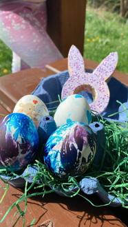 Weiter ging es in der Woche mit dem Gestalten von Eierbechern und das Färben von Eiern. An vier Stationen konnten die Kinder ihrer Kreativität freien Lauf lassen. Die Eierbecher waren in Form eines Osterhasen, der mit Décopatch beklebt werden konnte. Bei Décopatch handelt es sich um eine kreative Basteltechnik, bei der man dekorative Papierstücke mithilfe eines speziellen Klebers auf verschiedene Oberflächen aufbringt. So entstehen einzigartige und individuell gestaltete Objekte. An den anderen Stationen konnten Eier mit verschiedenen Färbtechniken verschönert werden. Ob mit extra Stiften oder mit Servietten und Milch. Ein besonderes Highlight war das Färben mit Hilfe von Küchenrolle, Essig und Lebensmittelfarbe. Dabei sind die schönsten Marmorierungen entstanden.