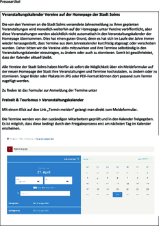 Alle Vereine der Stadt Solms haben hierfür ab sofort die Möglichkeit über ein Meldeformular auf der neuen Homepage der Stadt ihre Veranstaltungen und Termine hochzuladen, zu ändern oder zu stornieren. Sogar Bilder oder Plakate im JPG oder PDF-Format können dort passend zum Termin zugefügt werden.
