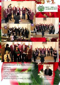Der Frauenchor Albshausen unter der Leitung von Frau Cornelia Schmerer, begleitet am E-Piano durch Frau Christine Theiß trug folgende Stücke vor: „Ihr von morgen“ (Udo Jürgens); „All night, all day“ (Alexander Hohenfels); „Wünsche zur Weihnachtszeit“ (Udo Jürgens). Der Vortrag sowie die Liedauswahl gefiel dem Publikum. Der MGV gesellte sich zu den Sängerinnen. Gemeinsam sangen sie das Lied „Lobe den Herrren“ (J. G. Herzog), dirigiert von Annerose Halama. Es folgten Dankesworte und -gaben durch Markus Baroth. Die Veranstaltung abschließend sprach Pfarrer Hoßbach allen Anwesenden den Segen zu. Nach einem gemeinsam gesungenen „Oh, du fröhliche“ wurden wir in den frühen Abend entlassen. Der Eintritt zur Veranstaltung war übrigens frei, um Spenden wurde gebeten. Der Erlös, so hat es der Vorstand im Nachhinein beschlossen, soll dem Hospizverein in Wetzlar zugute kommen.