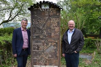 Burkhard Meth von der EAM übergibt das XXL-Insektenhotel an Bürgermeister Frank Inderthal
