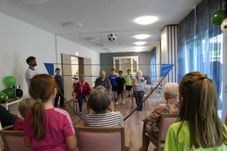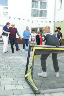 Den Innenhof, den die Kinder schon von ihren regelmäßigen Auftritten kennen, hatte das Pflegeteam in einen kleinen Fußballplatz umgestaltet. Hier schossen Kinder und Senioren abwechselnd auf das Tor. Im Innenbereich wurden Sitzyoga und Volleyball angeboten. Am Volleyballnetz standen gemischte Teams aus Kindern und Senioren und warfen sich den Ball zu. Obwohl keins der Kinder Sitzyoga kannte, ließen sich doch ein paar von ihnen darauf ein. „Entspannend war das,“ war das Resümee von Max.