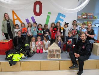 Die netten Feuerwehrmänner bringen an dem Tag das Lernmaterial mit und üben mit den Kindern auch mit voller Schutzkleidung, ob es die Rettungsaktion ist oder die Rufnummer wählen. Im Löschfahrzeug durften viele Schätze entdeckt und bestaunt werden. Zum Schluss und zur Erinnnerung gabs ein Abschiedsfoto mit der Feuerwehr.