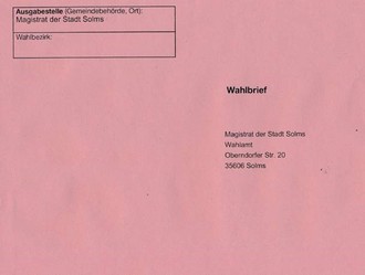 Diese Wahlbriefe wurden dem Wahlamt der Stadt Solms von der Landeswahlleitung zur Verfügung gestellt, wobei der Hinweis auf die Direktwahl des Landrates nicht aufgenommen wurde.