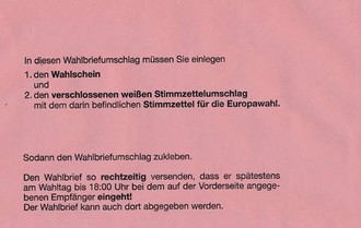 Entgegen der Beschriftung der Ziffer zwei auf der Rückseite des roten Wahlbriefes: "den verschlossenen weißen Stimmzettelumschlag mit dem darin befindlichen Stimmzettel für die Europawahl" wird dieser rote Wahlbrief für beide Wahlgänge der kombinierten Wahl (Europawahl und Direktwahl des Landrats) am 09.06.2024 verwendet.